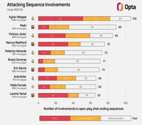 西甲本赛季有效进攻排名情况:姆巴佩以106次位居第一,佩德里以89次位居第二_西甲直播