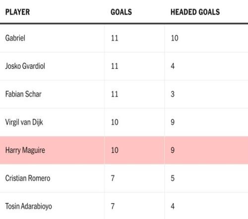 自2019年夏天以8000万英镑加盟以来,马奎尔已在各项赛事打入17球,其中13球(约76.5%)为头球。同期,英超进球超过10球的后卫中,只有本·米、范戴克和祖玛比他有更高的头球进球比例。2023-24赛季以来,在英超的中卫里,只有阿森纳的加布里埃尔进球数多于马奎尔(加布里埃尔11球,马奎尔10球)。也只有他的头球进球数(10个)多于马奎尔(9个)。