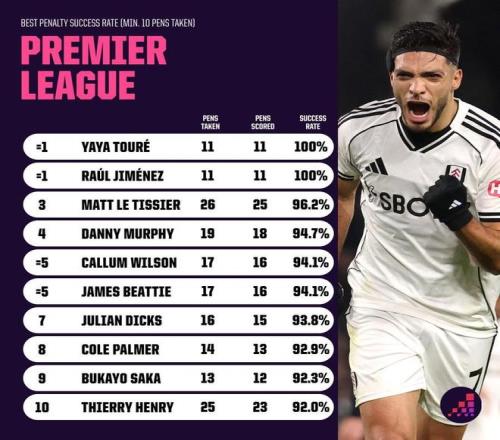 英超历史点球命中排行:劳尔希门尼斯和亚亚图雷均11罚全中